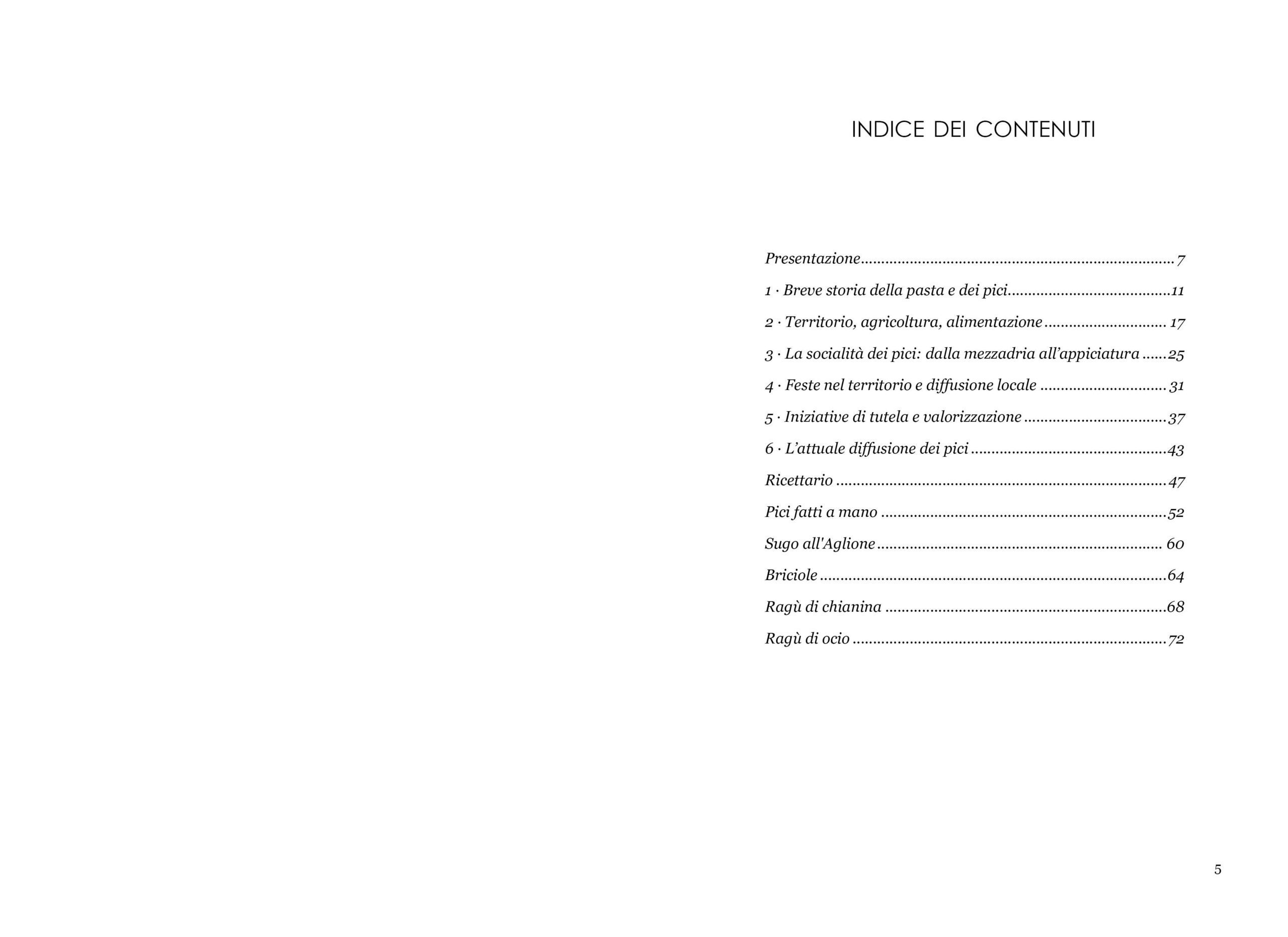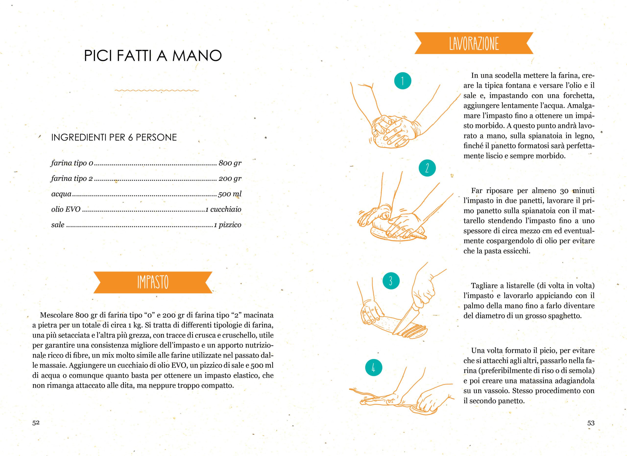 Contiene la ricetta per realizzare i pici fatti a mano, con il disciplinare di produzione degli Amatori Pici Chianciano, e quattro condimenti tipici della tradizione contadina della Valdichiana.