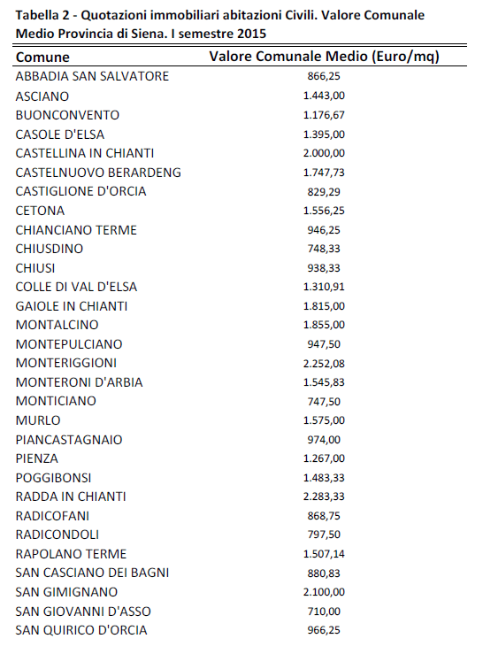 Iniziamo col dire che il valore medio di vendita della Provincia di Siena è di 1.340 Euro al metro quadrato per abitazioni civili con stato conservativo “normale”. Se suddividiamo il territorio provinciale in SEL (Sistemi Economici Locali), possiamo osservare che il territorio con il valore medio di mercato più elevato è l’Area Urbana senese con un prezzo al metro quadrato di 2.250 Euro. Segue l’area del Chianti con 1.961 Euro al metro quadrato e l’Alta Valdelsa con 1.417 Euro; troviamo poi il SEL Crete Senesi Val d’Arbia, con 1.276 euro al metro quadrato, la Val di Merse con 1.274 Euro ed, infine, la Valdichiana Senese con 1.100 Euro e l’Amiata Val d’Orcia con 1.059 Euro.