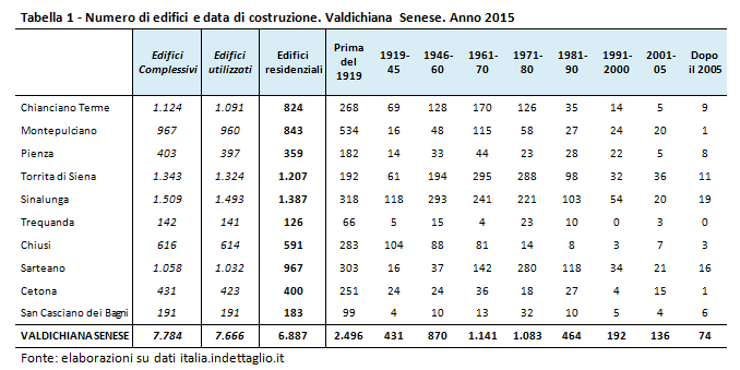 In questa uscita di Prospettiva Valdichiana cercheremo di capire meglio quale è l’età degli edifici del nostro territorio, analizzando i dati di italia.indettaglio.it, che raccoglie le principali informazioni dei comuni italiani, concentrandoci, come di consueto, sul territorio della Valdichiana Senese. In Valdichiana Senese sono presenti complessivamente 7.784 edifici, dei quali 7.666 utilizzati. Di questi ultimi, 6.887 sono adibiti a edilizia residenziale, 779 sono invece destinati a uso produttivo, commerciale o altro (cfr. Tabella 1).