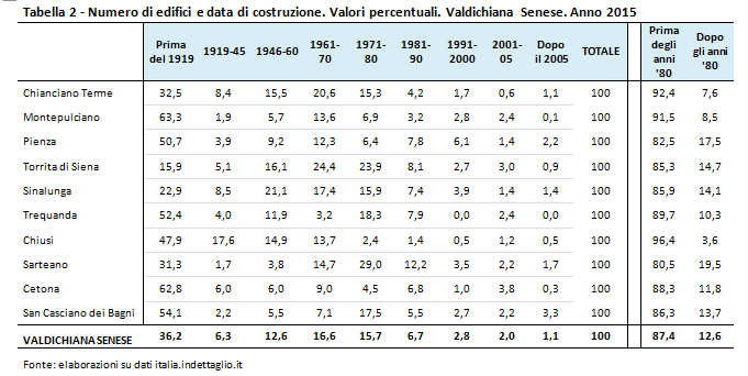 Osservando tali dati dal punto di vista percentuale, possiamo vedere come il 36,2% degli edifici residenziali siano stati costruiti prima del 1919 e solamente l’1,1% dopo il 2005 (cfr. Tabella 2). Considerando lo spartiacque del 1980, vediamo come l’87,4% degli edifici residenziali sia stato costruito prima del 1980, e solamente il 12,6% successivamente. La percentuale di edifici costruiti prima del 1980 sale poi vertiginosamente in comuni come Chiusi (96,4%), Chianciano Terme (92,4%) e Montepulciano (91,5%).