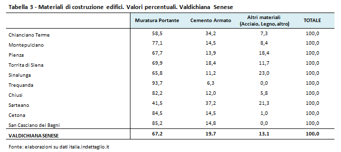 Anche in questo caso, alcuni comuni si discostano dal valore medio del territorio, come ad esempio Trequanda, dove il 93,7% degli edifici residenziali sono stati costruiti in muratura portante, o Sarteano, dove solamente il 41,5% degli edifici residenziali è stato costruito in muratura portante.