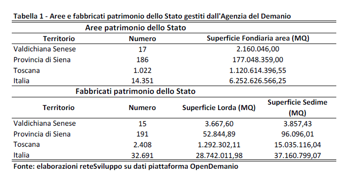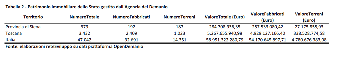 In provincia di Siena, lo Stato ha un patrimonio immobiliare stimato in circa 285 milioni di Euro, suddivisi in 258 milioni di Euro di fabbricati e 27 milioni di Euro di terreni. A livello regionale il patrimonio è di circa 5,3 miliardi di Euro: la provincia senese, pertanto, ha nel proprio territorio il 5,4% del patrimonio dello Stato situato in Toscana.