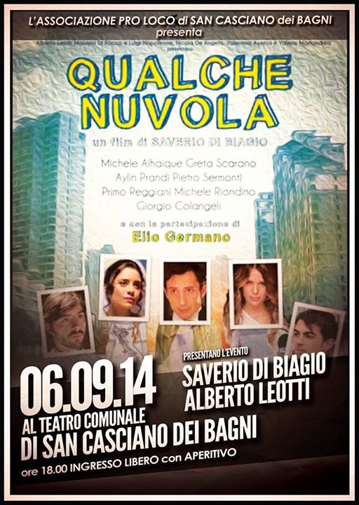 Sabato 6 settembre a partire dalle ore 18, si svolgerà presso il Teatro Comunale di San Casciano dei Bagni la proiezione del film “Qualche Nuvola”, di Saverio di Biagio. L’evento, organizzato dalla Pro Loco di San Casciano, prevede la partecipazione del produttore Alberto Leotti e del regista Saverio di Biagio, oltre a un aperitivo offerto a tutti i presenti.