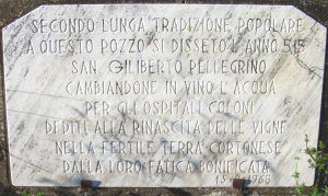 Non sono molte le notizie su questa leggenda, particolarmente diffusa nelle campagne di Cortona e legata alla religiosità popolare e ai riti di fertilità dei terreni. Le fonti non sono concordi neppure sul nome del pellegrino, che poteva chiamarsi Giliberto, Gilberto o Filiberto. La targa in marmo sul Pozzo di San Giliberto venne fatta apporre da don Sante Felici, che fu parroco dell’abbazia di Farneta e studiò la storia locale, fino a pubblicare nel 1967 il volume “L’Abbazia di Farneta in Val di Chiana”. Secondo la sua versione della leggenda, la tramutazione dell’acqua in vino fu opera del pellegrino Gilberto, rappresentato con la croce rossa sul saio, che si fermò a Montecchio per rifocillarsi durante il suo viaggio verso la Terra Santa. Il prodigio avvenne di fronte ad alcune donne, che diffusero la buona notizia per tutte le campagne.
