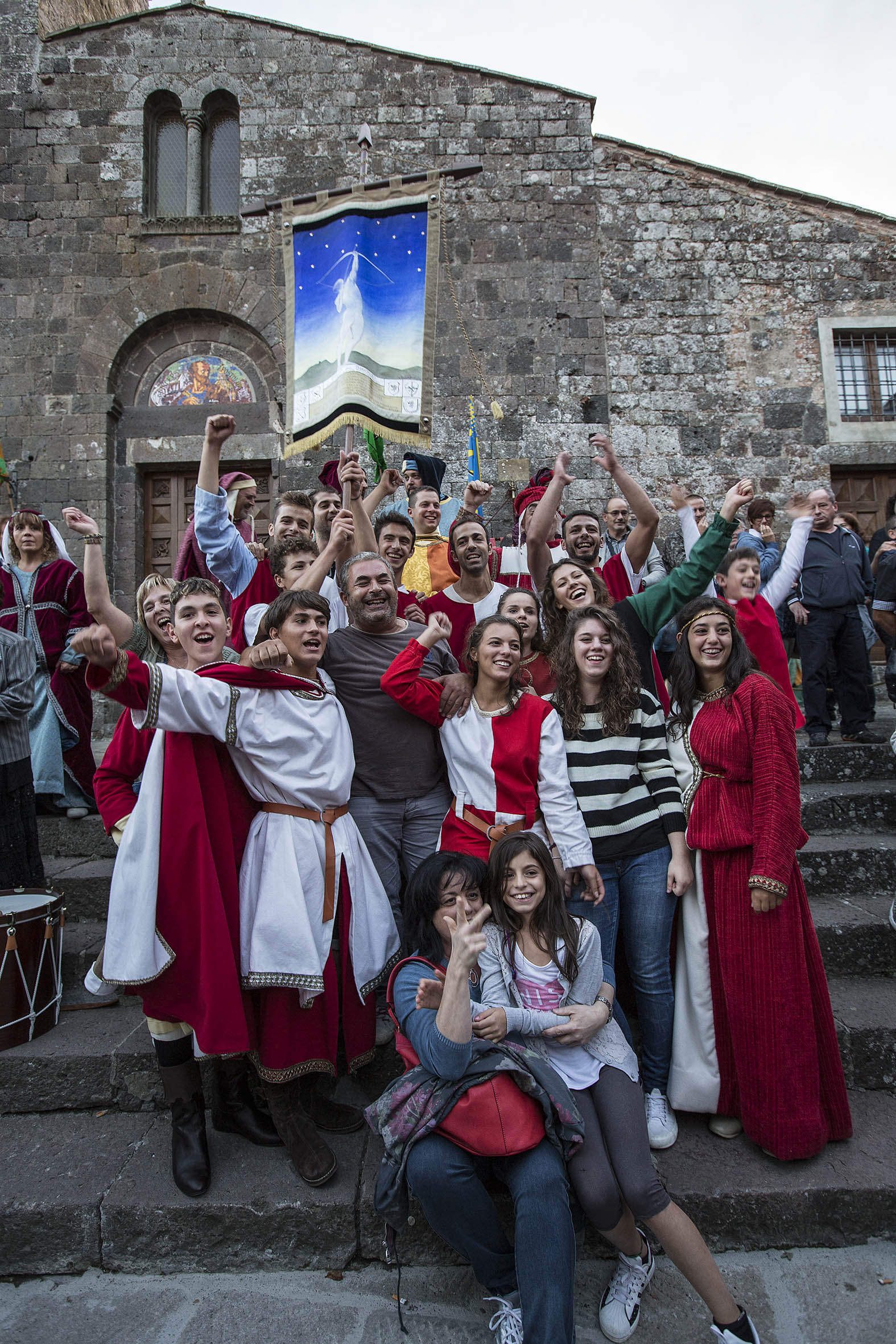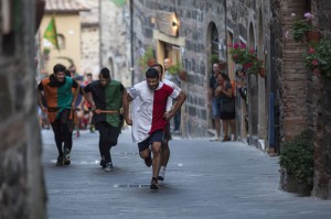 Viene naturale, dunque, il riferimento al medioevo che permea l’iniziativa, a partire dai costumi di foggia duecentesca usati nel folto corteo che ha solcato le vie del centro storico, al mattino. A seguire, la santa messa alla chiesa di San Pietro (ore 11) e la presentazione (ore 12) del drappellone con la benedizione delle contrade. La contesa vera e propria è iniziata nel pomeriggio (ore 16,30) con la gara di tiro con l’arco, il cui risultato ha determinato le penalità in partenza, insieme ad altri fattori: ci sono state penalizzazioni per le contrade che non hanno schierato corridori residenti a Radicofani. La “griglia” ha visto al primo posto Borgo Maggiore e, a scalare, Contingano, Castelmorro, Borgo Castello e Bonmigliaccio. Dopo l’esibizione di sbandieratori e musici, e la verifica del peso dei bigonzi (riempiti di creta) la gara ha visto subito lo scatto perentorio di Contignano, che non ha dato scampo agli avversari.