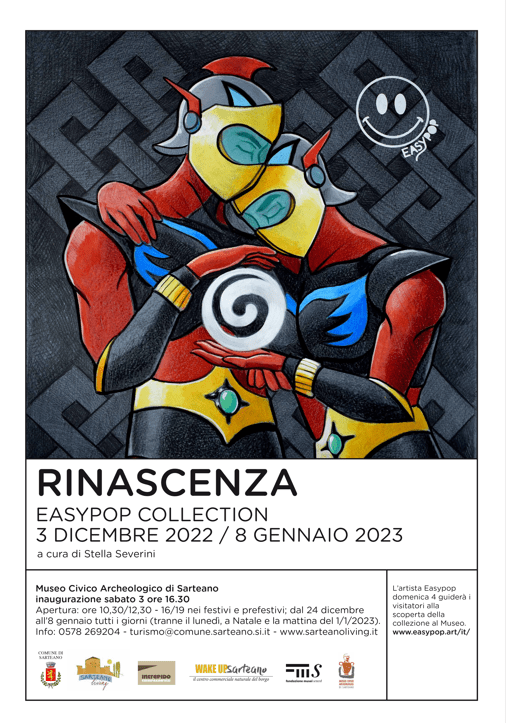 Sarà inaugurata sabato 3 dicembre, alle ore 16:30 nel Museo civico archeologico di Sarteano, la mostra d’arte contemporanea “Rinascenza. Easypop Collection”. Presenta dipinti, sculture e disegni tra miti e fantastici eroi dell’artista romano Roberto Mazzeo, in arte Easypop. L’artista sarà a disposizione per accompagnare la visita anche nel giorno successivo. La mostra, curata da Stella Severini per conto di Intrepido servizi (la società che gestisce i beni culturali per conto del Comune di Sarteano), è parte integrante del grande cartellone del Natale, caratterizzato dalla straordinaria collezione di scene della natività. Il “Paese dei presepi” si arricchisce così di ulteriori iniziative culturali (un’altra mostra, con foto e testi dedicati a chiese palazzi e opere d’arte comprese tra 1500 e 1600 sarà inaugurata al Ram, Rocca Manenti Art il 10 dicembre).