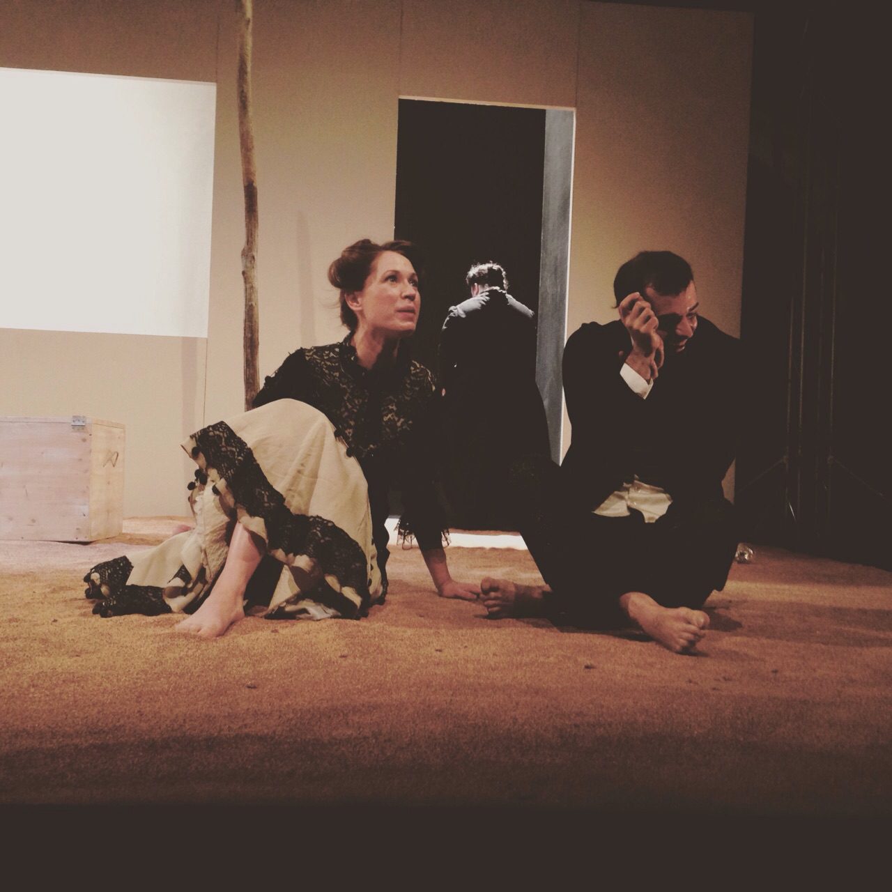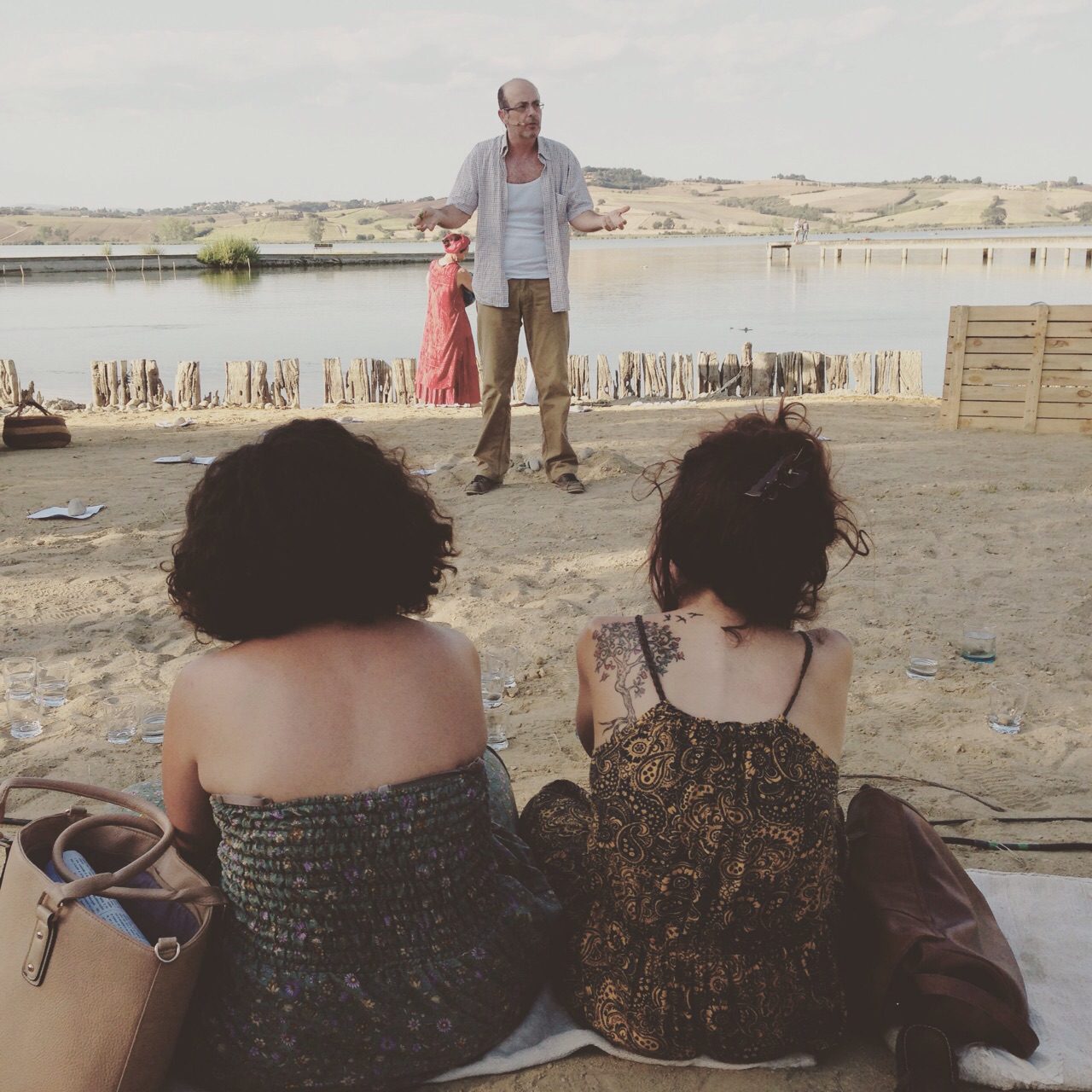 Il sole dona un notevole tono lirico a tutto il panorama. La luce delle 18 meno dieci già anticipa una precisa e rassicurante corale delle livellature ambientali che vanno sovrapponendosi. Sul pontile, seduti, Pierangelo Margheriti e Giulia Roghi ripassano le battute. Mi avvicino per salutarli, per dire loro “Merda merd…” . Mi fermo. Stanno dicendosi le battute con una naturalezza irripetibile. Seduti sul bordo del lago. È un’immagine definitiva, irraggiungibile. Metateatrale. Mi blocco per quella notifica di cui sopra, riguardo alla basica elementare della formazione scenica. Quell’edificazione del demone del palco – che è una spiaggia – quella monodica diffrazione di gesti, sguardi e parole donate all’aria, prima dello spettacolo, per poi ritrovare tutto, nella stessa aria dell’azione scenica. Più in là Calogero Dimino è già il personaggio che andrà a rappresentare.