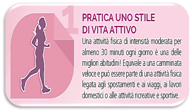 – al colon, riduzione del rischio del 50 % se si svolge almeno 6-9 h di attività fisica a settimana