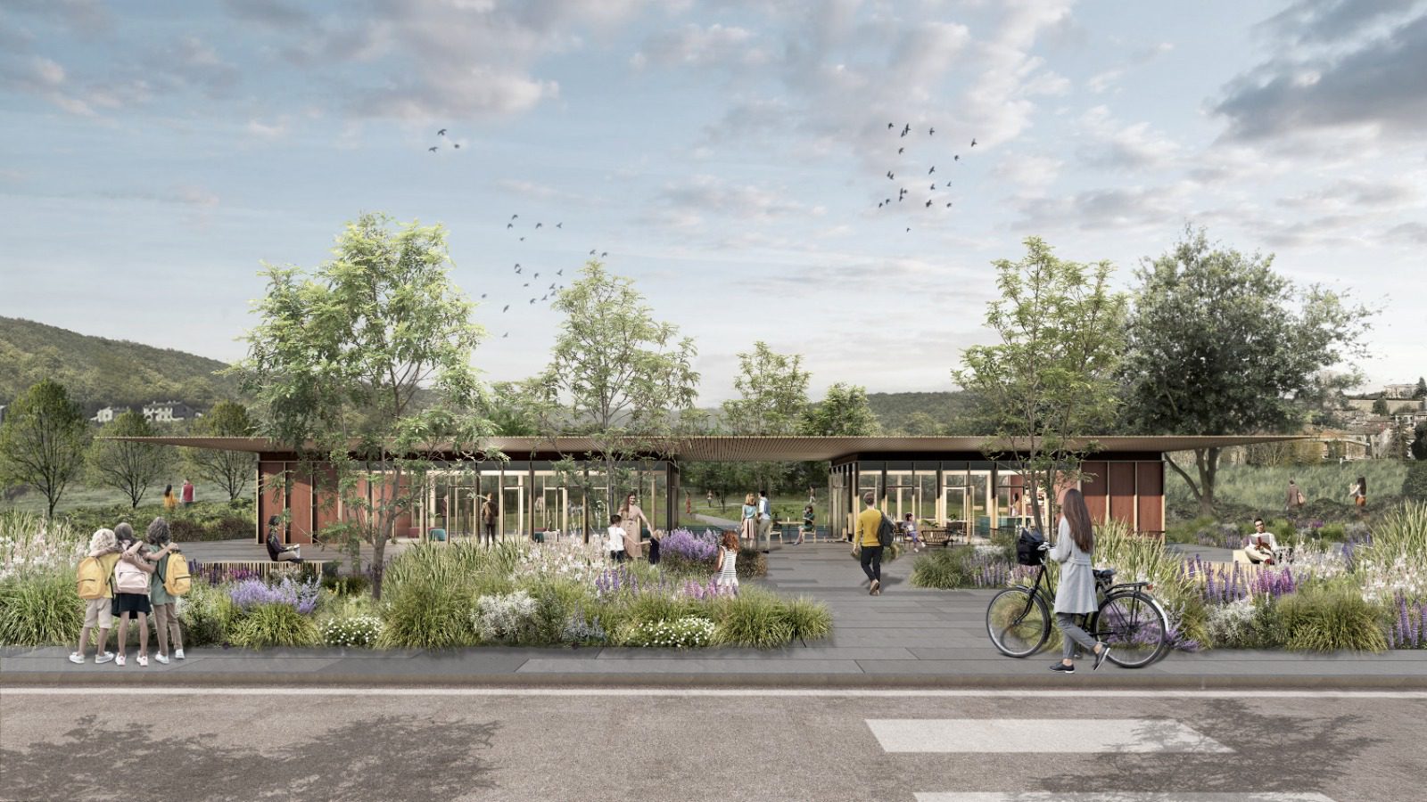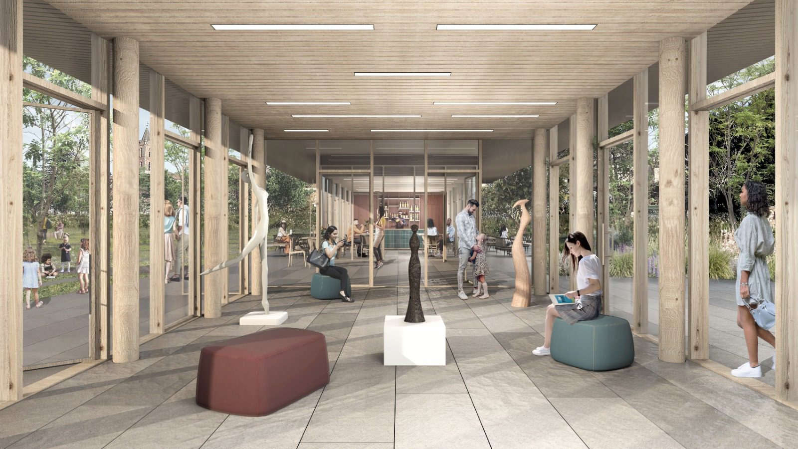 Un padiglione ecosostenibile, in legno e vetro, è stato pensato come filtro e ingresso verso il nuovo parco. Una struttura ideata per generare attività ed interazione sociale. I due volumi trasparenti che ospitano il punto somministrazione e lo spazio polifunzionale (adibito ad accogliere piccole mostre ed eventi, oltre alle attività delle associazioni locali), sono uniti e protetti da una importante lama di copertura, pensata come risposta all’emergenza sanitaria degli ultimi due anni in modo da favorire la socialità attraverso la creazione di spazi esterni, protegge in estate dal calore e dai raggi solari ed in inverno dalle intemperie. La copertura ha anche una forte valenza ecosostenibile, infatti, oltre a riparare le vetrate laterali e ridurre i consumi energetici, può accogliere pannelli solari e fotovoltaici e raccogliere l’acqua piovana.
