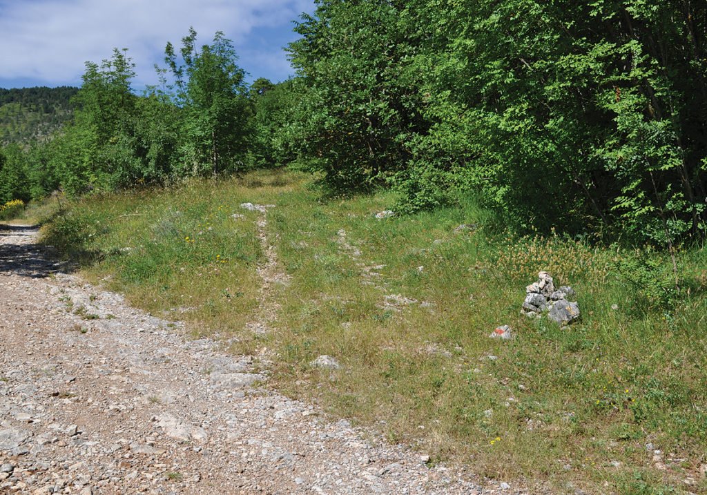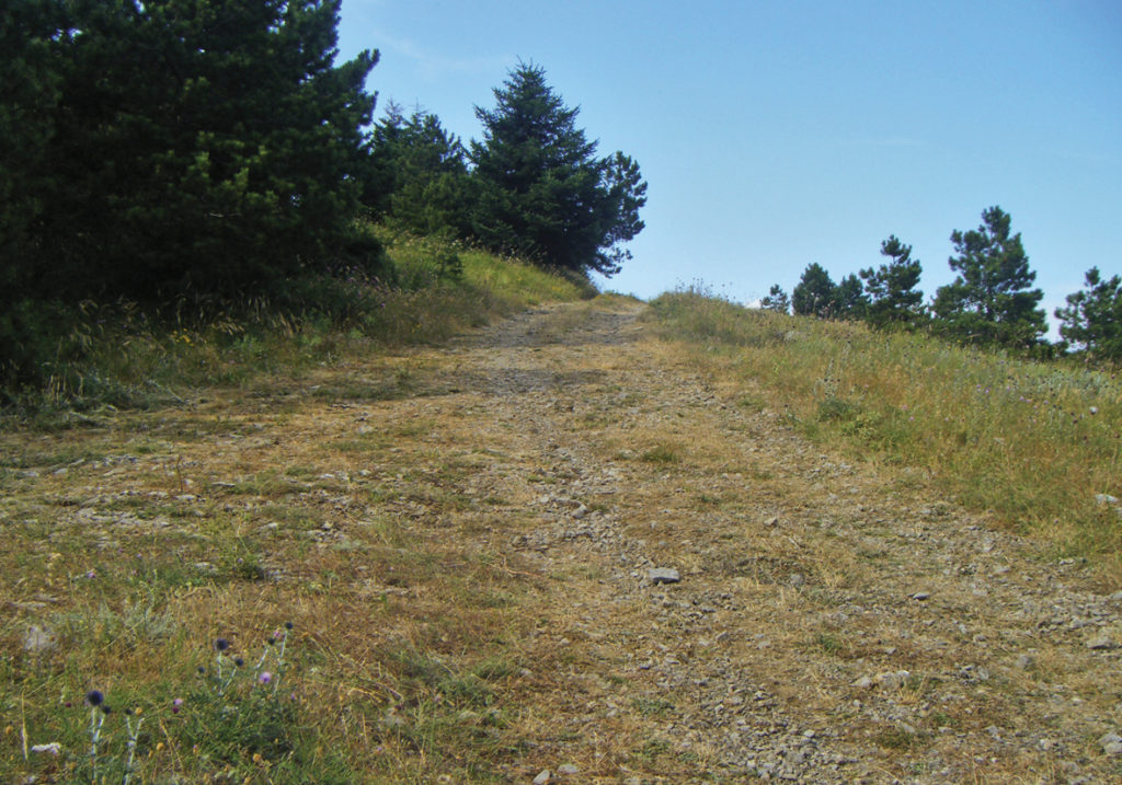 This route, like the previous one, starts from Cancelli. From there, take the road to Fonte Vetriana, as in route 6, just before the hamlet of Valle Saccaia (photo 7.1). After 200 metres, you will see a red spot on a stone on your right which indicates the path to the peak of the mountain (photo 7.2). The path takes to a clearing from which you can enjoy an amazing view on the town of Cetona and all of Val d’Orcia (photo 7.3). From here, you can follow either a slope path or an easier road (photo 7.4) which turns around the peak and reaches the edge of a wood, on Route 4.
