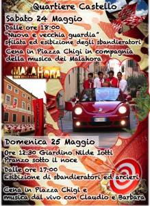 Primo appuntamento della domenica, invece, è alle ore 12.30 con l‘immancabile “Pranzo sotto al Noce”, il pranzo nel giardino del Quartiere proprio sotto un secolare nocio. Poi, dalle 17.00 Piazza Chigi si colora ancora una volta di Bianco e Rosso con l’esibizione degli Alfieri con le loro bandiere e degli Arceri Castellani che magistralmente scoccheranno dardi. La serata si concluderà davanti ad una gustosissima cena sulle note del duo locale “Claudio e Barbara”.