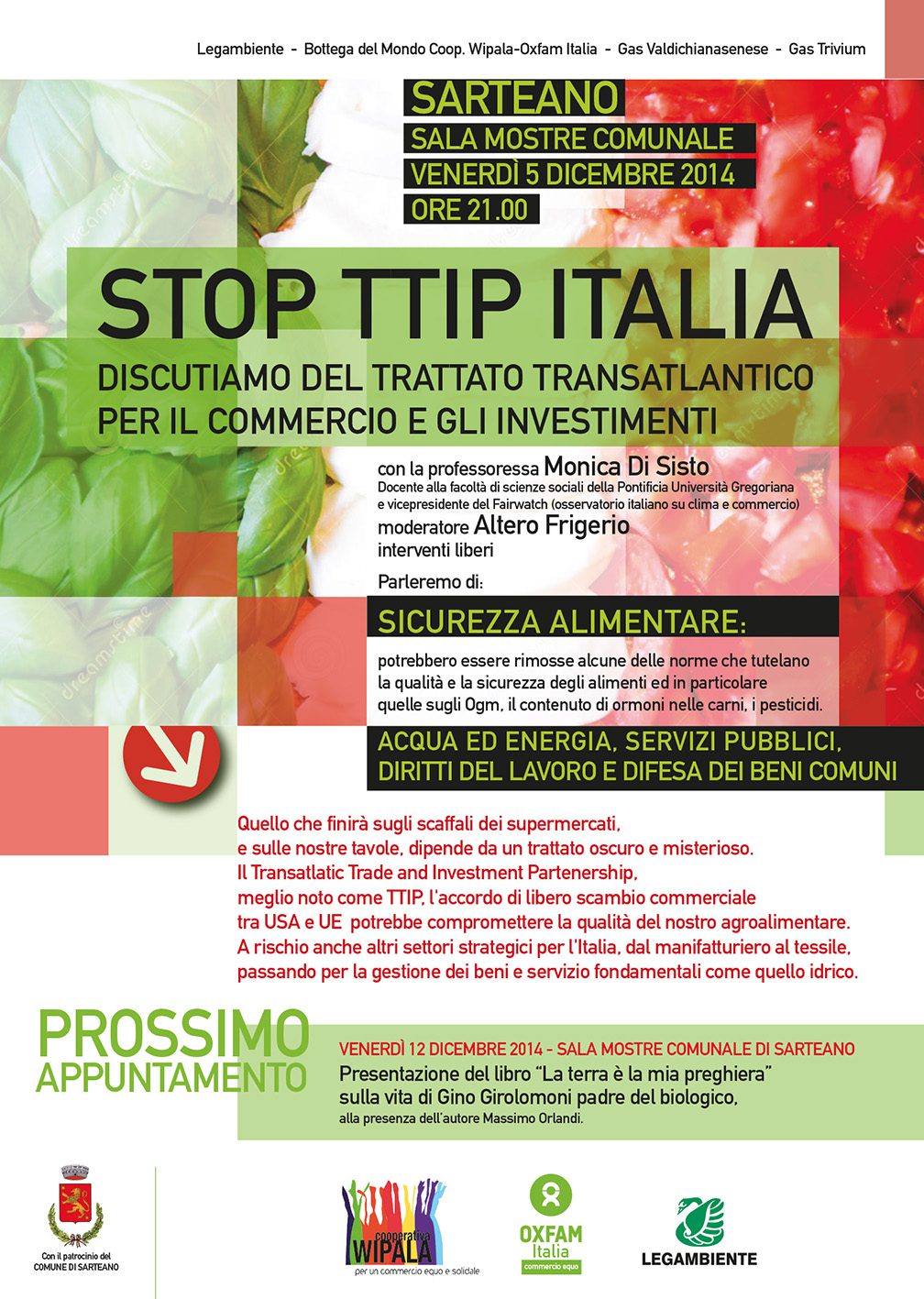 Quello che finirà sugli scaffali dei supermercati e nelle nostre tavole dipende da un trattato misterioso e oscuro ai più. Il TTIP potrebbe compromettere la qualità del nostro agroalimentare. Tutto questo verrà discusso a Sarteano nella Sala Mostre Comunale venerdì 5 dicembre alle ore 21:00. L’evento è stato organizzato da Legambiente, Bottega del Mondo Coop. Wimpala-Oxafam Italia, Gas Valdichianasenese, Gas Trivium ed interverrà la professoressa Monica Di Stisto, docente alla facoltà di scienze sociali della Pontificia Università Gregoriana e vicepresidente del Fairwacht (osservatorio italiano su clima e commercio). Modera Altero Friferio.