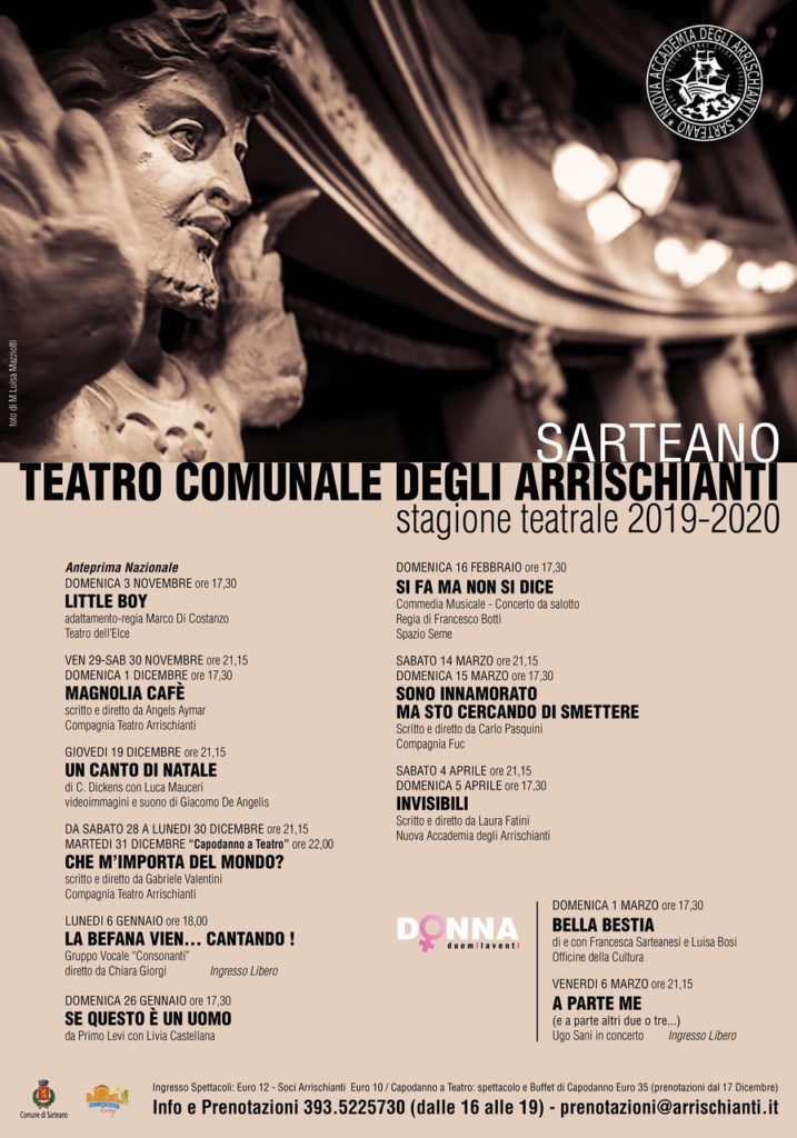 La stagione teatrale 2019/2020 di Sarteano propone un fitto calendario con 11 spettacoli: l’impegno organizzativo della piccola compagnia è ben conosciuto nel territorio, ma la nuova stagione stupisce per varietà e qualità delle proposte: monologhi, commedie, teatro giovani, commedia musicale, residenze nazionali e anteprime. Non mancano spettacoli di teatro del territorio e proposte musicali, per una stagione rivolta a un pubblico vario e contraddistinta dalla qualità attoriale e dalla ricerca drammaturgica sui testi proposti: gli Arrischianti lavorano da anni in questa direzione, che spazia dalla formazione (i laboratori teatrali per bambini, ragazzi e adulti condotti da Laura Fatini), alla produzione di testi originali e prime nazionali, alle residenze di artisti internazionali.