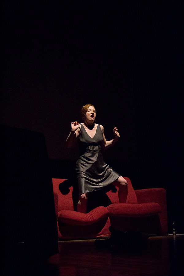 Il monologo è intelligentemente correlato con ritagli di “Via col Vento”, proiettati sul fondale di scena; il ‘film preferito’ della Braun, immedesimatasi nei panni di Rossella O’Hara. “Gone with the Wind”; La sua favola da vivere, l’epopea americana della guerra di secessione, la storia di quello stesso popolo che stava bombardando il loro impero, e che li avrebbe portati al cianuro e alla canna di una pistola. Trasportata con cambi vocali, singhiozzi sia retorici che gutturali, maestria di modulazione della voce in un cut up verbale longilineo di copertura fonetica della follia, la tirata della Fracassi è ineccepibile, portata avanti con abilissima disposizione corporea. Un pugno allo stomaco che ci mette ancora una volta di fronte all’orrore, al nulla più assoluto attraverso il quale la storia ha dovuto, e dovrà ancora, fare i conti.
