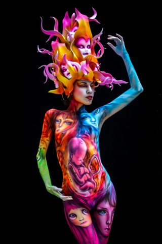 Il bodypainting, che vede le sue origini nelle usanze di popoli tribali Africani, Indiani e centro Americani, è quella particolare forma d’arte in cui il corpo umano diviene la tela dell’artista. Per questo motivo è per sua natura temporaneo: fondamentale è, dunque, l’utilizzo di mezzi quali fotografia e video.