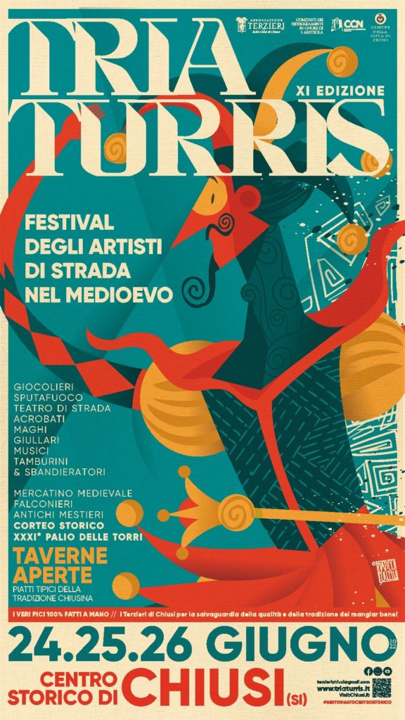Ritorna a Chiusi il Tria Turris, Festival degli artisti di strada nel Medioevo. L’evento, organizzato dall’Associazione Terzieri di Chiusi, è articolato in tre intense giornate, in occasione della festa della Patrona Santa Mustiola.